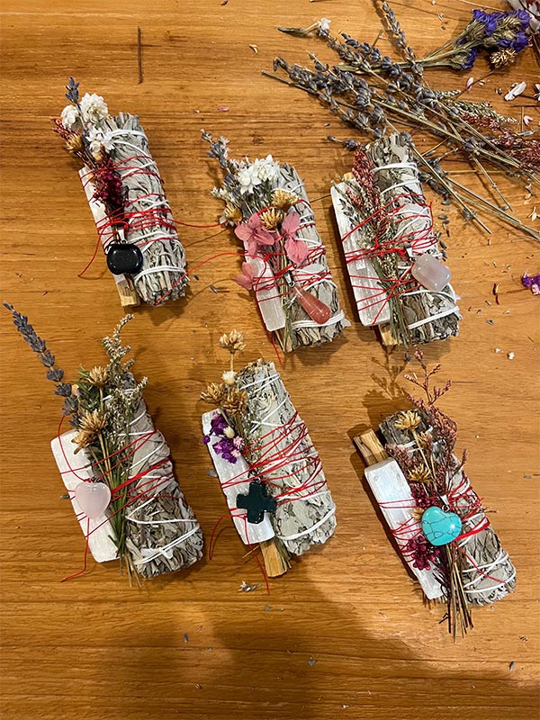Bundle the elements together with your dried flowers, wrap with your string, add your charm, and knot 7 times. Enjoy this gorgeous and delightfully smelling bundle for as long as you like.