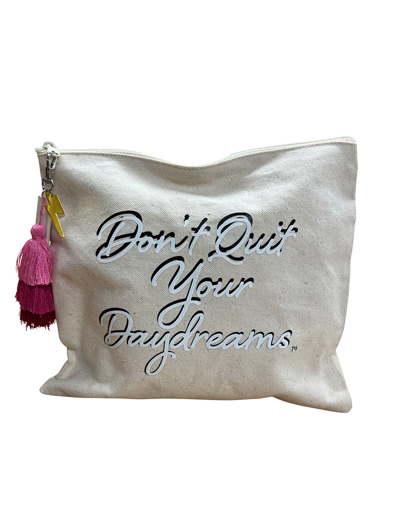 Keep track of bench supplies, makeup, accessories, and more with this limited edition handmade 2 tone DQYD Canvas Pouch! This small pouch is constructed from a Natural colored canvas fabric and features a zipper at the top and adorned with a monochromatic pink tassel