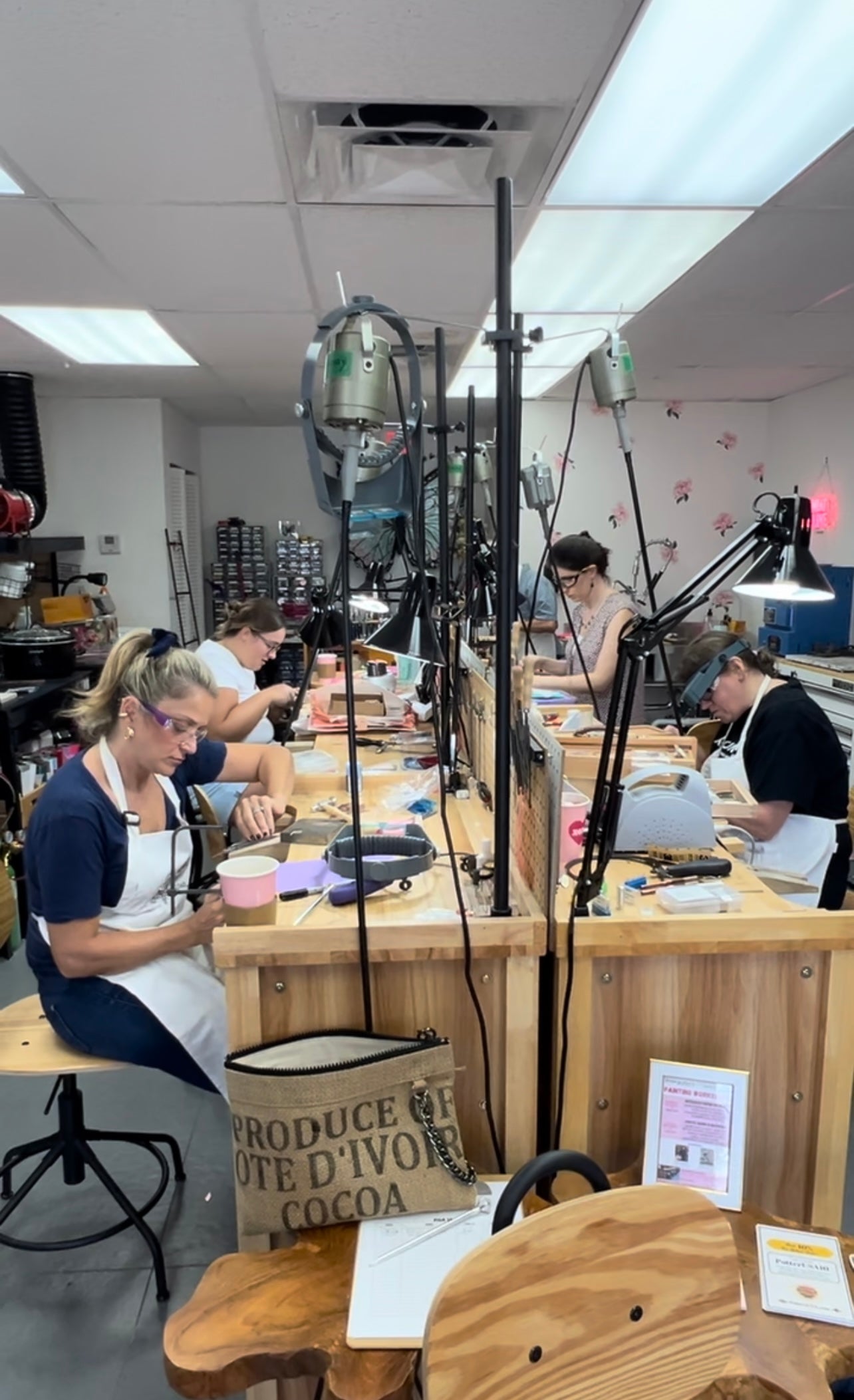 Don’t Quit your Daydreams is designed with 8 state of the art, professional jeweler’s benches. Each bench is fully equipped with a personal flex shaft, selection of hand tools ie: jeweler’s saw, hand files, needle files, wire cutters, a selection of burs, etc.
